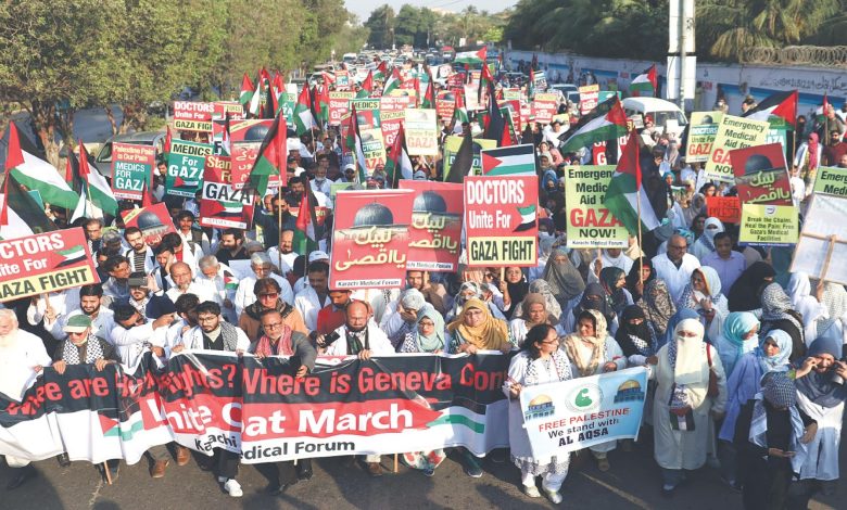 Thousands of doctors, healthcare professionals and paramedics staged a rally on Stadium Road to express solidarity with the people of Palestine and condemn atrocities of Israel against civilians of Gaza.